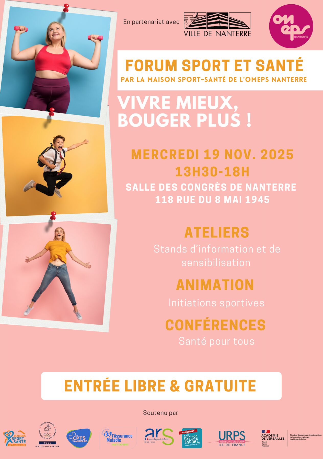 Le Forum Sport-Santé se tiendra le mercredi 19 novembre 2025, de 13h30 à 18h, à la salle des Congrès de Nanterre. Cet événement gratuit est ouvert à tous et vise à encourager l’activité physique pour améliorer la santé et le bien-être à tout âge.